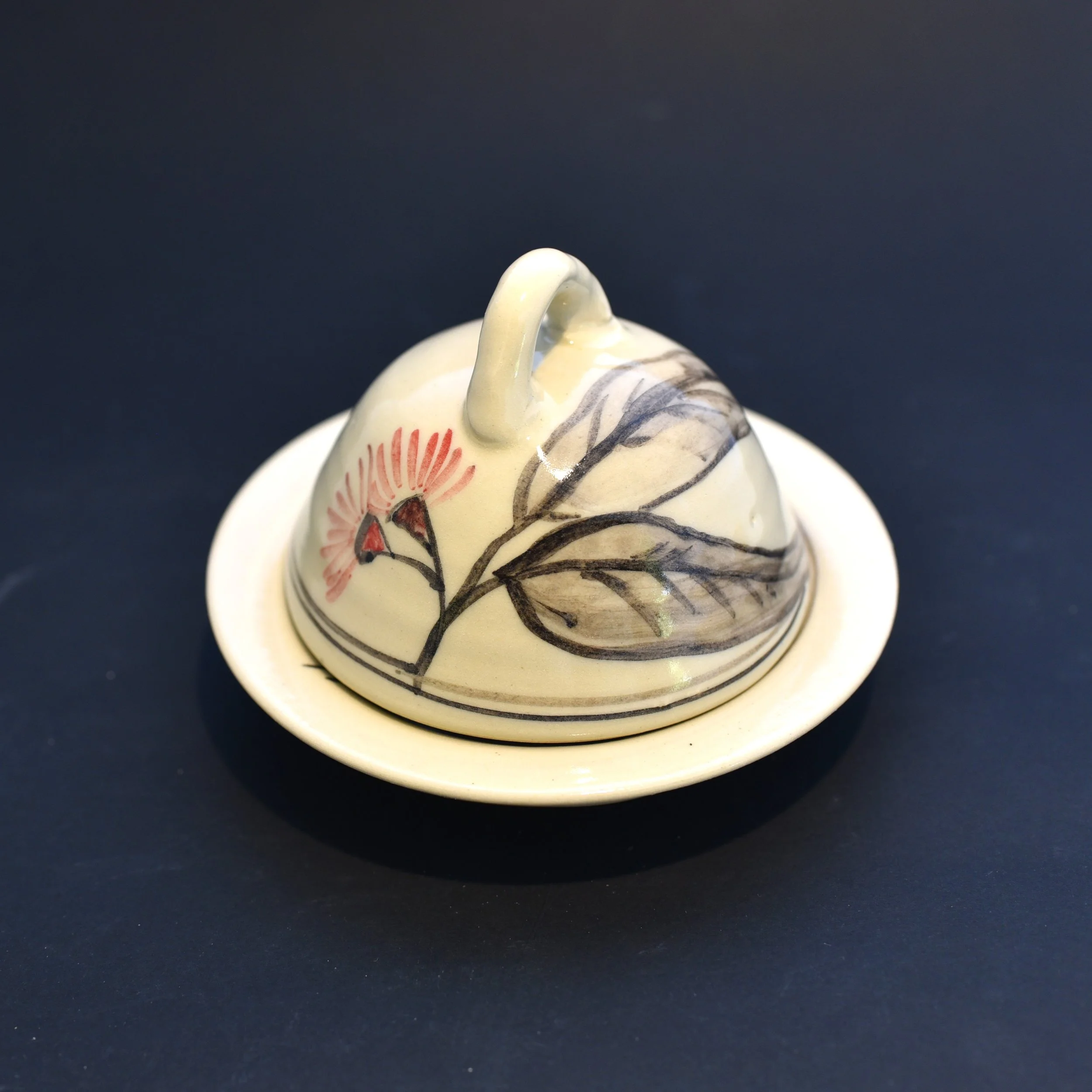 Store › Butter dish Image 1 of 2 Image 2 of 2 Butter dish $45.00 A great way to store butter, to keep it soft, or cheese. Aprox. 13cm wide Design: Wattle Grevillea Bottlebrush Gumnut Gum Blossom Yellow Blossom Pomegranate Lemons Quantity: Add To Cart Added! A great way to store butter, to keep it soft, or cheese. Aprox. 13cm wide